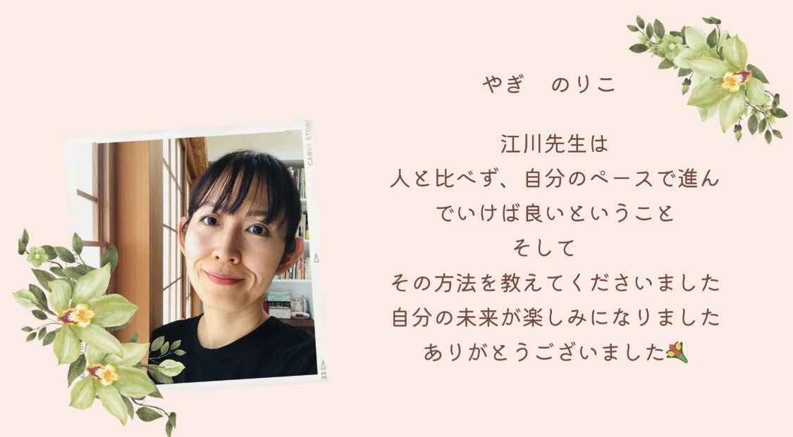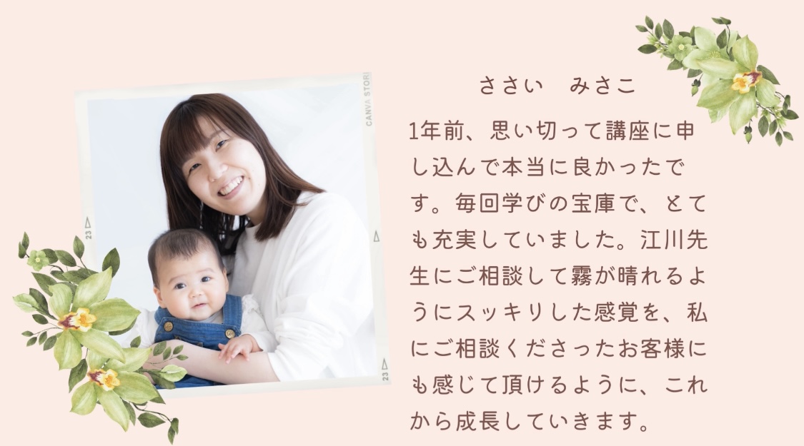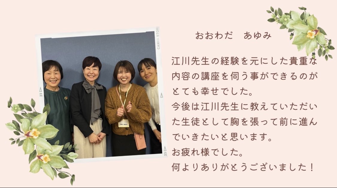 受講を迷っていらっしゃるかたも受講を心に決めていらしゃるかたもぜひ説明会に参加して自分の目と耳で江川佳代と